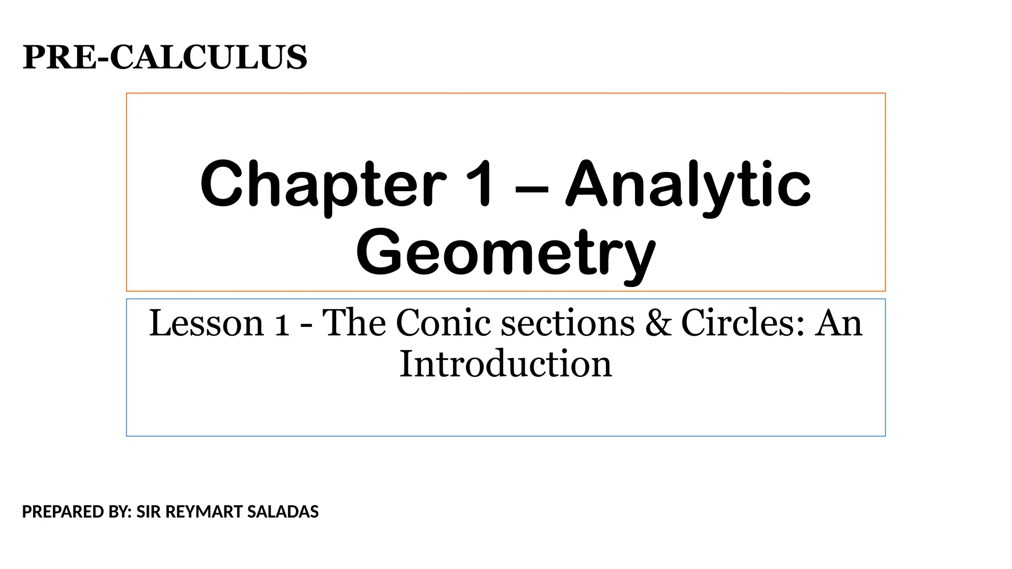 Chapter 1 introduces conic sections, including circles, parabolas, ellipses, and hyperbolas, explaining how they are formed by intersecting a cone with a plane. It defines a circle as the locus of points equidistant from a center and provides the standard form of a circle's equation along with examples for practice. The chapter concludes with methods to determine the center and radius of a circle from its general equation.