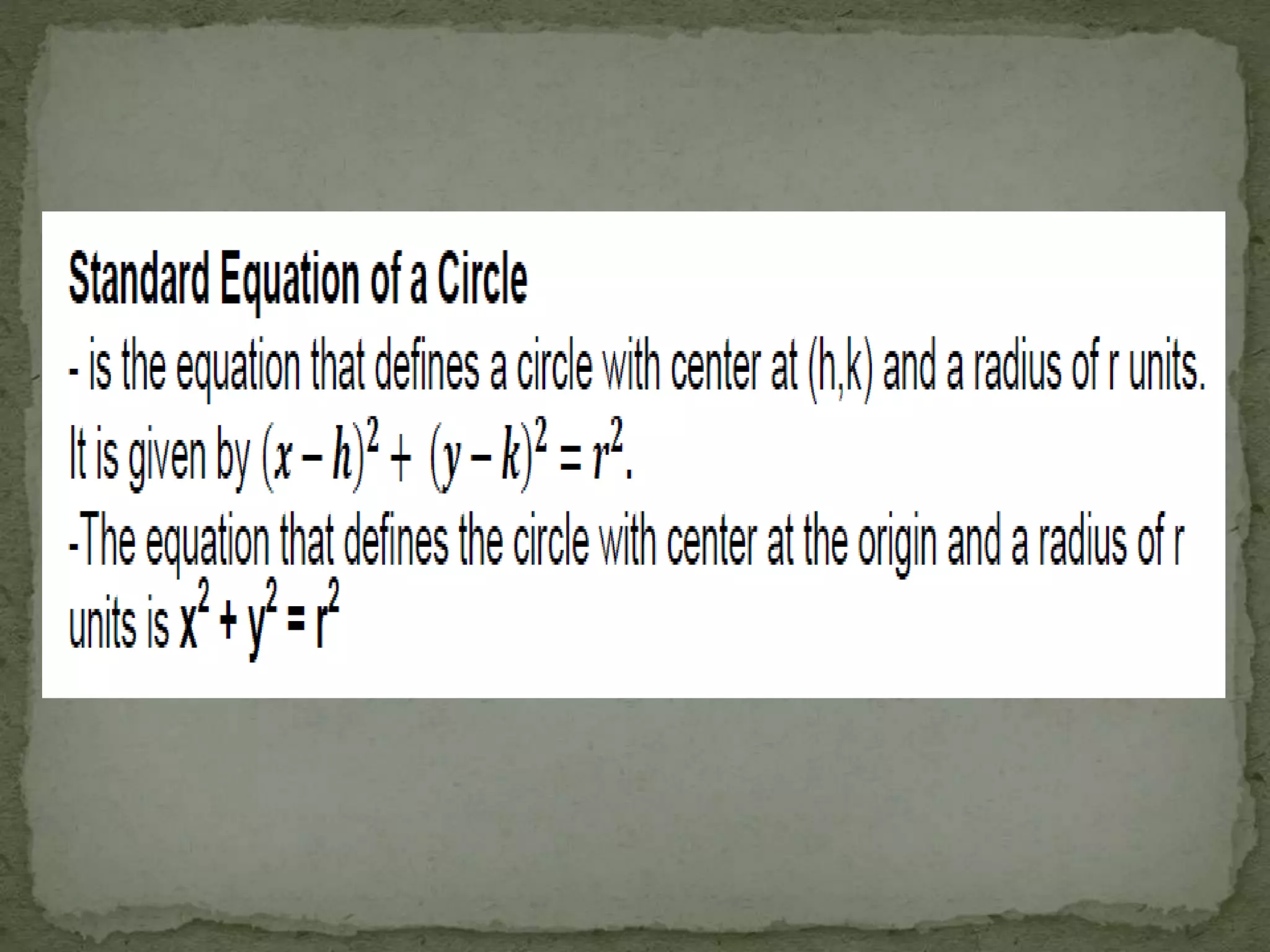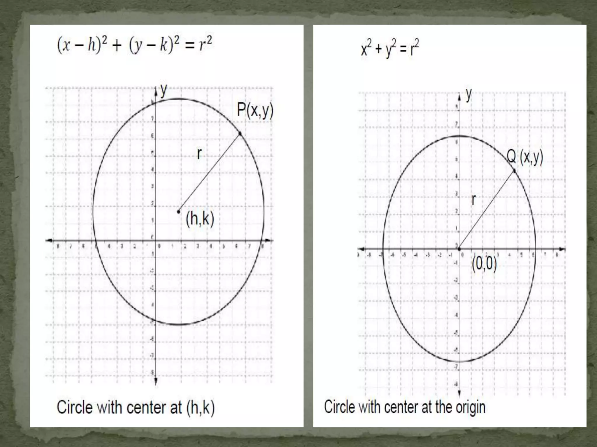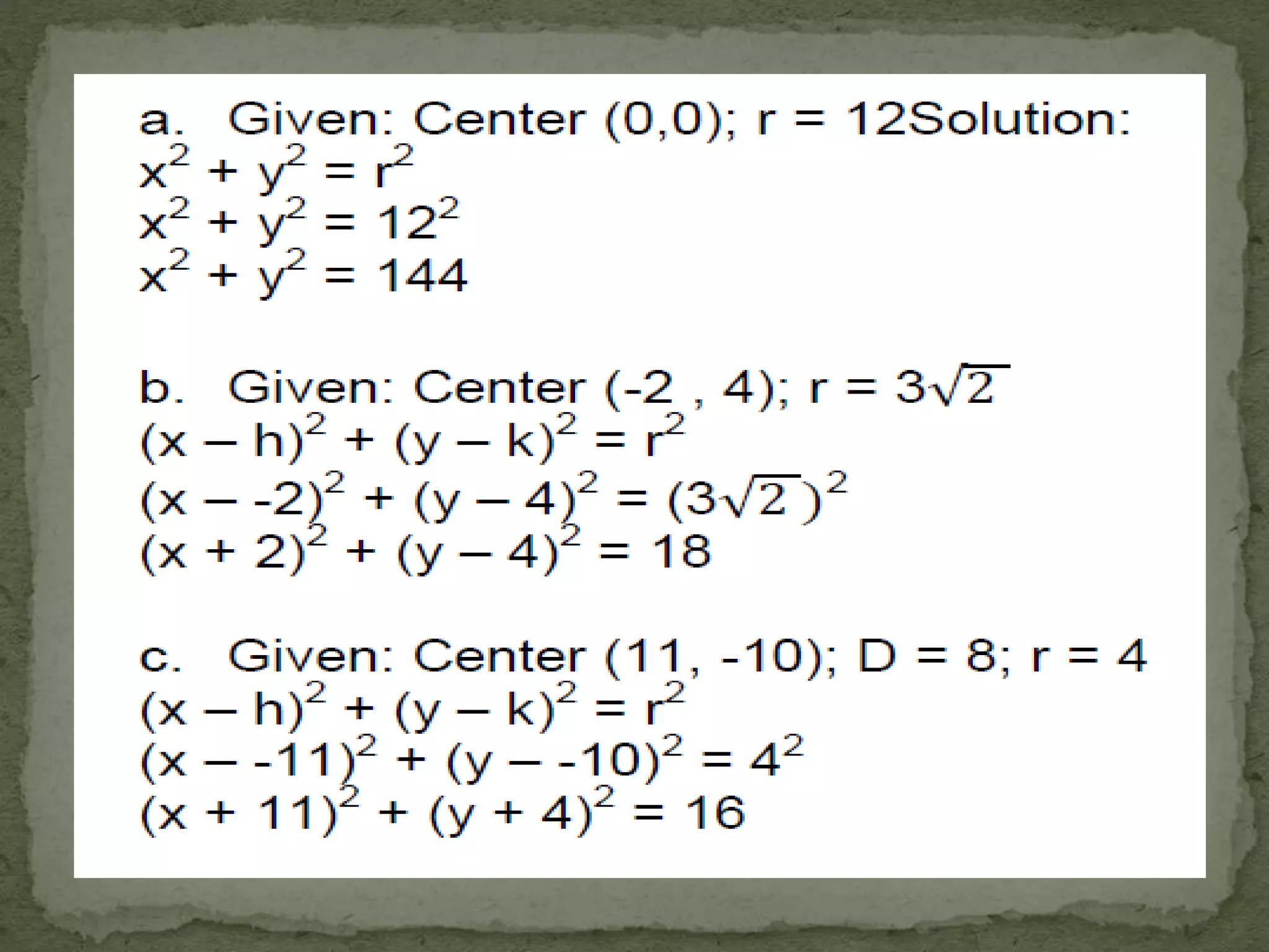 This document contains a math lesson on the equation of a circle. It begins by defining the standard form of a circle equation as (x-h)^2 + (y-k)^2 = r^2, where (h,k) are the coordinates of the center and r is the radius. Examples are given of writing the equation of a circle given the center and radius. It also discusses the center-radius form of the equation of a circle and examples of problems involving finding the equation of a circle under different conditions.