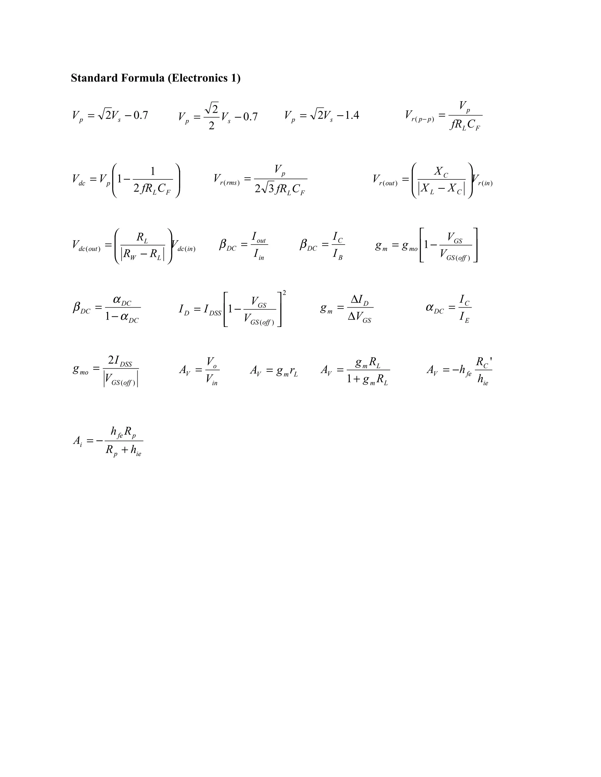 This document contains standard formulas used in electronics. It includes formulas for peak voltage, voltage ripple, DC voltage, voltage gain, current gain, transconductance, drain current, voltage amplification, and input impedance. The formulas contain variables like Vp, Vs, R, L, C, f, XC, Vr, β, gm, ID, VGS, RL, RC, hfe, Rp, and hie.