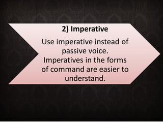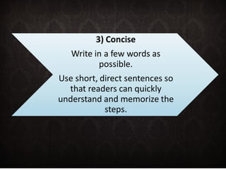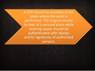 The document discusses the format and guidelines for writing standard operating procedures (SOPs). It provides details on who should write SOPs, who they are intended for, when they should be written and tested, and an example format. Effective SOP writing uses short, clear, step-by-step imperative sentences rather than passive constructions. Guidelines include writing and testing SOPs before a new job, revising when processes or equipment change, and updating them regularly.