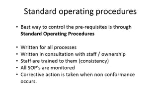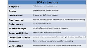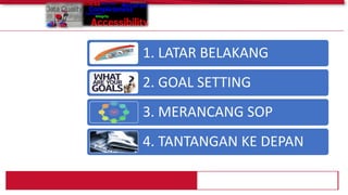 Dokumen tersebut membahas pentingnya Standard Operating Procedure (SOP) dalam menjamin konsistensi dan mencegah masalah dalam suatu organisasi. SOP dikembangkan setelah kecelakaan kereta api pada 1856 yang menewaskan 50 orang. SOP berisi pedoman langkah-langkah untuk setiap proses penting guna mencapai efisiensi, keselamatan, dan keberhasilan bisnis serta menjamin pengalaman pelanggan yang konsisten. Pembuatan SOP meliputi per