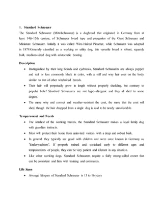 The standard schnauzer, originating in Germany, is a medium-sized working dog known for its distinctive beard and eyebrows, typically black or pepper and salt in color. This breed is loyal and protective, making for a great family pet, especially with proper training and socialization. Standard schnauzers have an average lifespan of 13 to 16 years and require a strong-willed owner for consistent training.