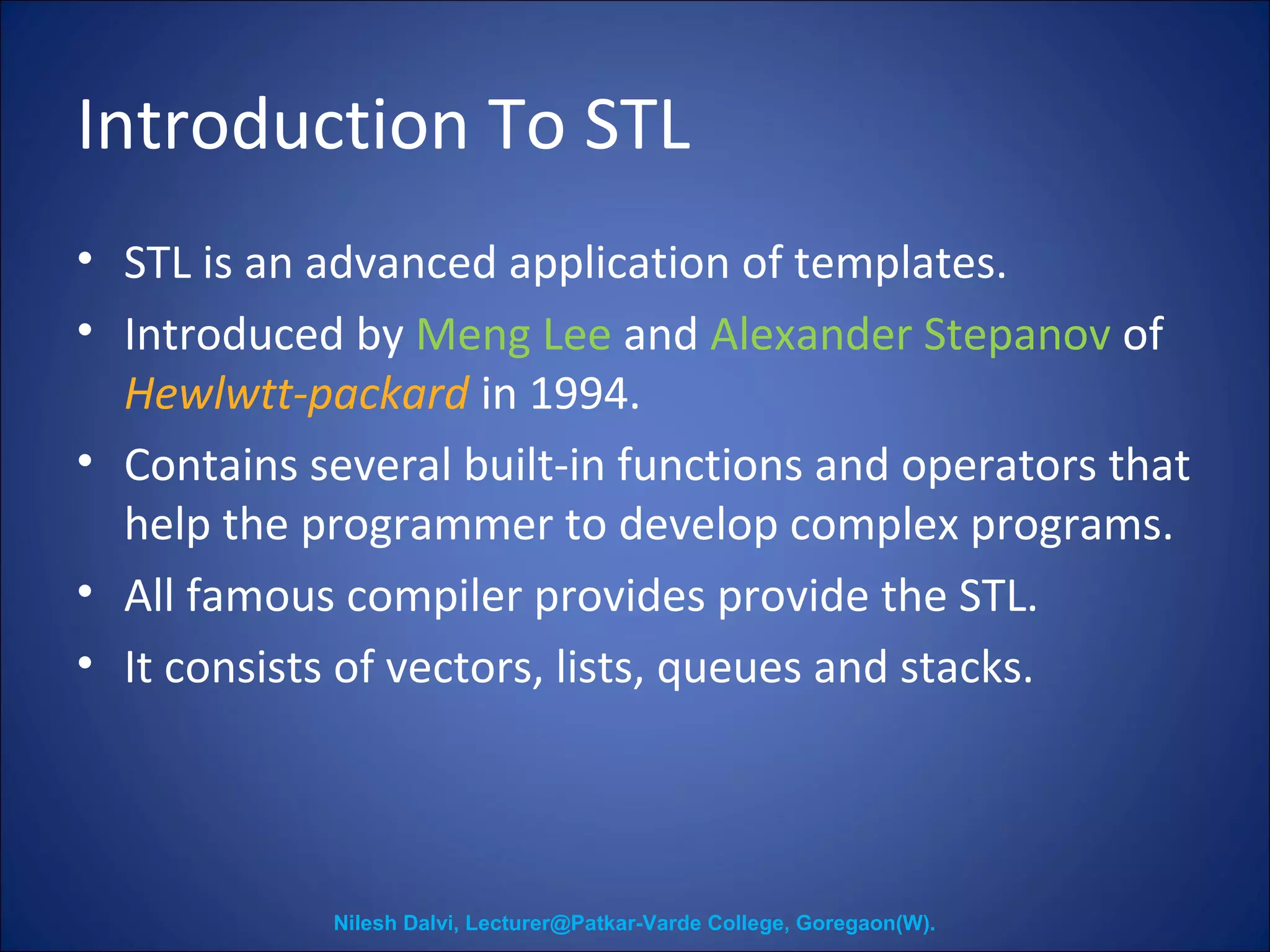 The document provides an introduction to the Standard Template Library (STL) in C++. It discusses that STL introduces templates, containers and algorithms that help develop complex programs. The key STL components include containers to store data, iterators to access data, and algorithms to manipulate data. It describes common STL containers like vectors, lists, maps that allow storing and organizing data. It also explains common container functions and algorithms like sort, find and merge that can be used to process container data.