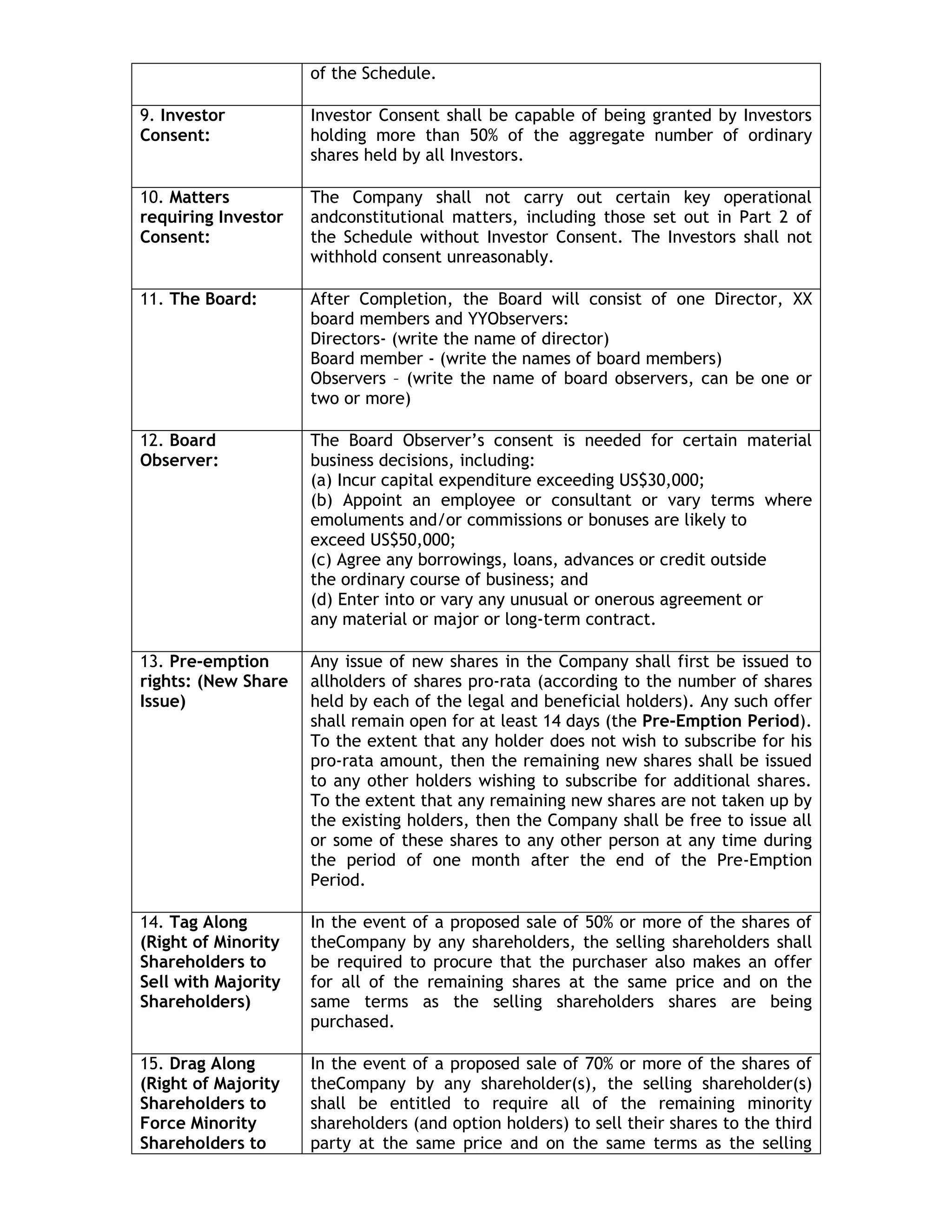 This document outlines the indicative heads of terms for an equity investment in a company, specifying the obligations, rights, and governance matters affecting both investors and the company. It details the investment structure, terms regarding share issuance, and consent requirements for key decisions. The proposal is non-legally binding, with a confidentiality clause in place, and must be accepted within 14 days to remain valid.