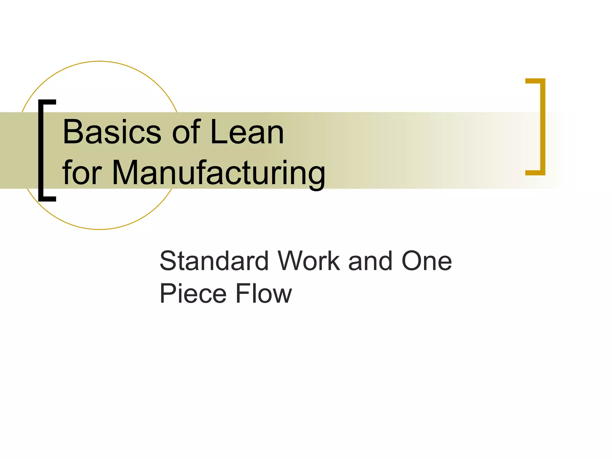 Lean manufacturing aims to eliminate waste through standard work and one-piece flow. Standard work establishes repeatable work sequences defined by operators. One-piece flow moves individual products continuously through processes to reduce wait time, lead time, and work-in-progress inventory. The benefits of one-piece flow include improved safety, quality, flexibility, productivity, and employee morale.