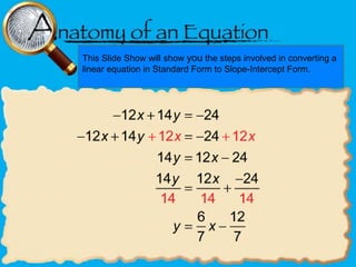 This slideshow will demonstrate how to convert a linear equation expressed in standard form into slope-intercept form by showing the steps to perform this type of algebraic transformation of a linear equation. It will guide the viewer through taking a linear equation given in standard form (Ax + By = C) and changing it into the slope-intercept form (y = mx + b).