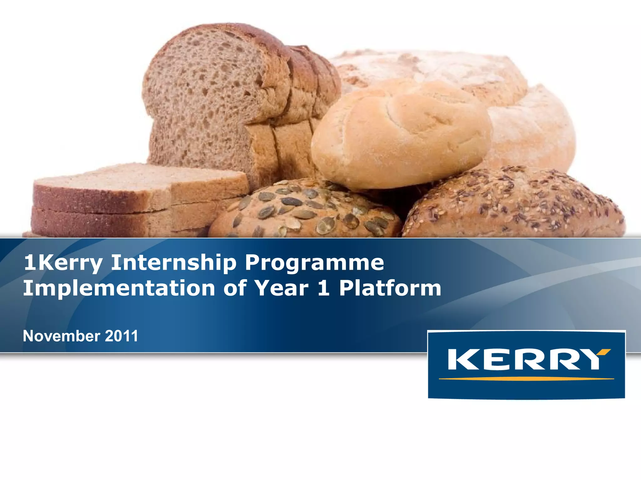 The document outlines Kerry's proposed internship programme. It discusses setting clear objectives for both Kerry and students. It proposes structuring the programme with phases including recruitment, onboarding, internship activities, and evaluation. It analyzes costs and savings, recommending 15 paid interns costing $133,211 the first year. Success will be measured by intern offer, acceptance, and conversion rates compared to national benchmarks.