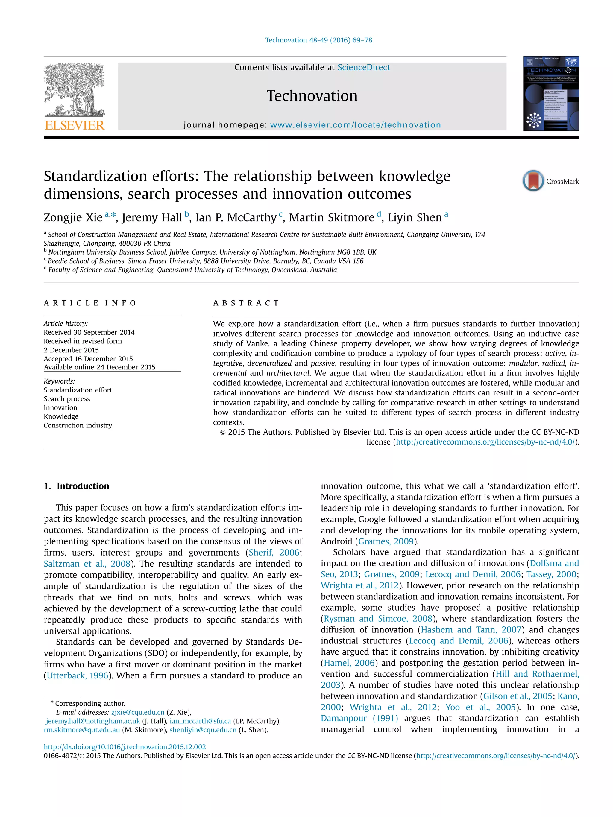 The document examines the relationship between standardization efforts, knowledge search processes, and innovation outcomes in firms, particularly through a case study of the Chinese property developer, Vanke. It identifies four types of search processes—active, integrative, decentralized, and passive—that lead to four corresponding innovation outcomes: modular, radical, incremental, and architectural. The study concludes that high codification of knowledge enhances incremental and architectural innovations while hindering modular and radical ones, and calls for further research across different industries to understand the complexities of standardization in innovation.