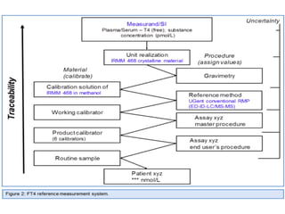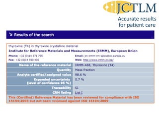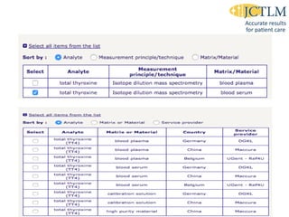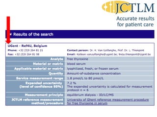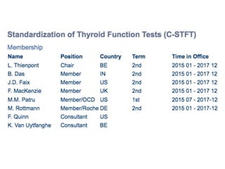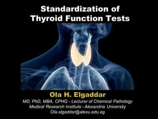 Standardization of thyroid function tests is important to ensure comparable results across laboratories. For tests of total T3 and T4, a reference measurement system exists using primary calibrators and isotope dilution mass spectrometry. For free T3 and T4, a conventional reference measurement procedure was established using equilibrium dialysis and liquid chromatography tandem mass spectrometry. For TSH, the measurand was defined as intact total TSH accounting for glycosylation, and an "All Procedure Trimmed Mean" statistical approach using multiple commercial assays on patient samples was adopted as a surrogate reference measurement procedure.