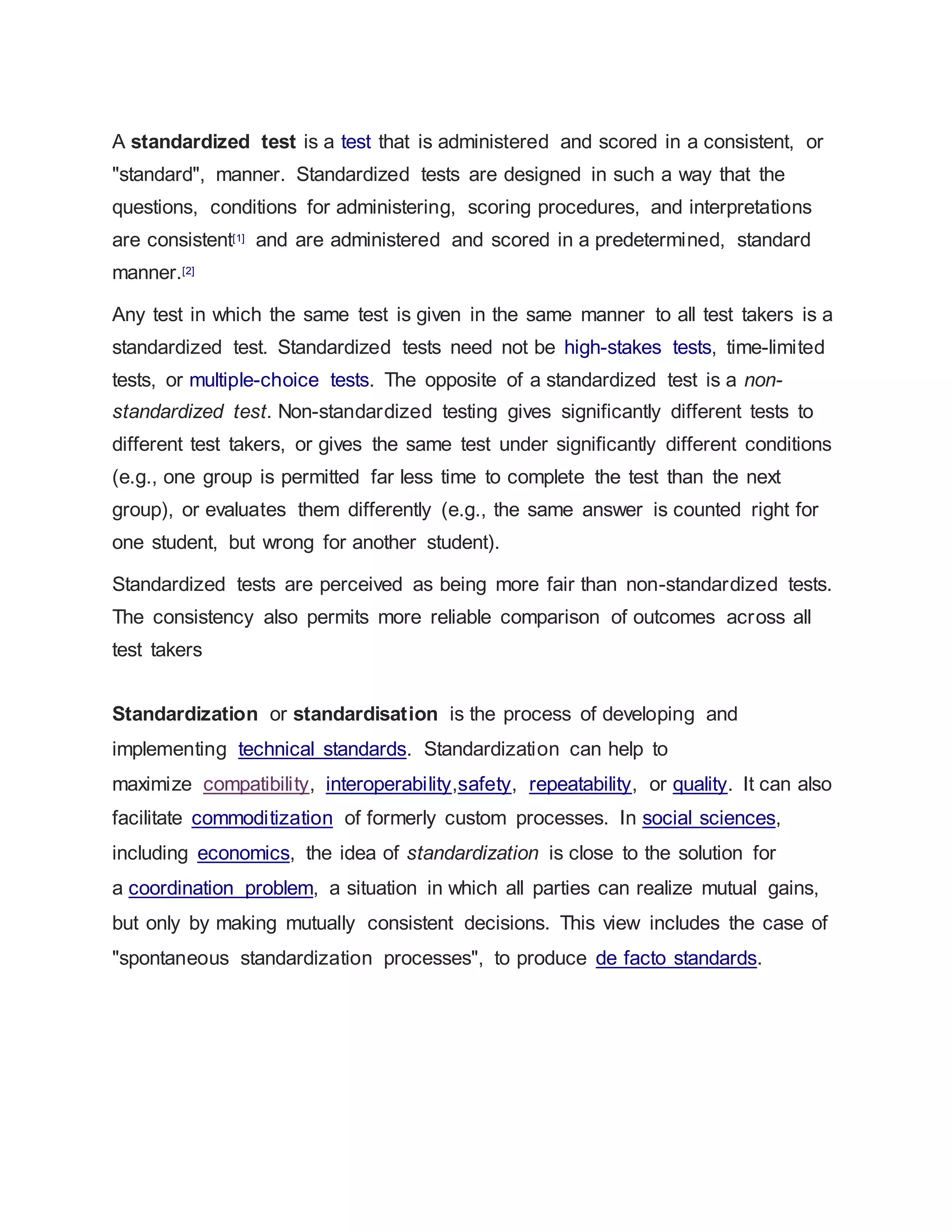 Standardized tests are designed and administered in a consistent manner. They are based on content standards that outline what students should know at each grade level. The development of standardized tests is a rigorous multi-step process that includes adopting content standards, developing test items, field testing items on students, building the final test using field-tested items, and setting performance standards to define proficiency levels. This process aims to create fair assessments that reliably measure student knowledge and identify areas where students are struggling or excelling.