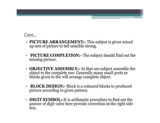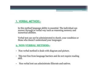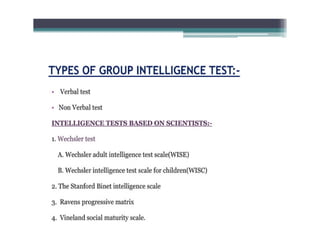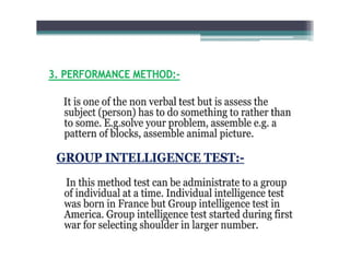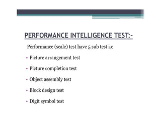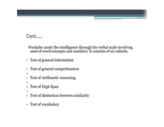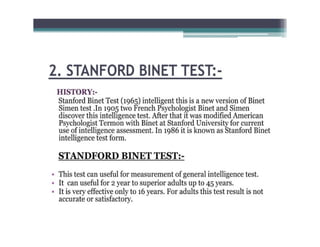 This document discusses standardized tools used in nursing. It defines standardized tools as validated questions or tests that have specific criteria and procedures to meet objectives consistently. There are five main types of standardized tests discussed: achievement tests, intelligence tests, personality tests, aptitude tests, and prognostic tests. Each type is defined, and examples of characteristics and uses are provided. The document also covers the construction, purposes, and important aspects of standardized tools and tests.