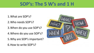 Standard operating procedures (SOPs) are written instructions that document routine processes and activities. This document discusses what SOPs are, who needs them, when and where they are used, why they are important, and how to write them. It provides guidelines for writing SOPs, including describing processes, preparing the documentation, obtaining approvals, and regularly updating and testing SOPs. Key elements that should be included are the process steps, equipment details, safety measures, common issues, and emergency procedures. SOPs are important for training, consistency, quality control, and regulatory compliance.