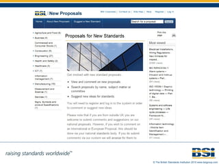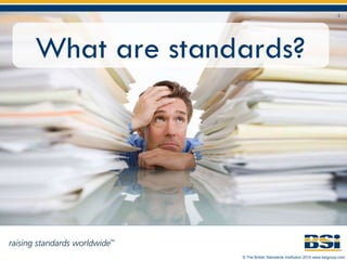 Standards and standardization have existed for thousands of years, becoming more widespread and formalized during the Industrial Revolution. The British Standards Institution (BSI) was founded in 1901 and plays a key role in developing technical standards both nationally through British Standards and internationally through organizations like ISO and CEN. Standards provide economic benefits and can help organizations improve processes, ensure safety and quality, and demonstrate compliance. Individuals and organizations can get involved in standards development in various ways.