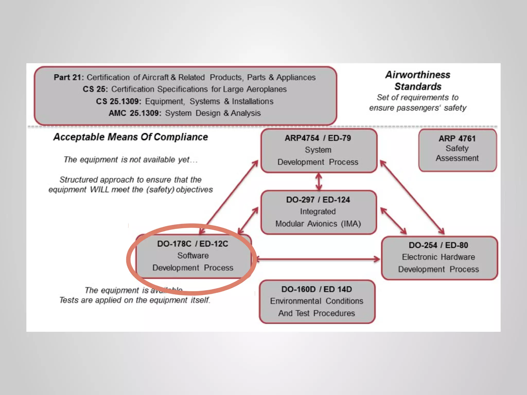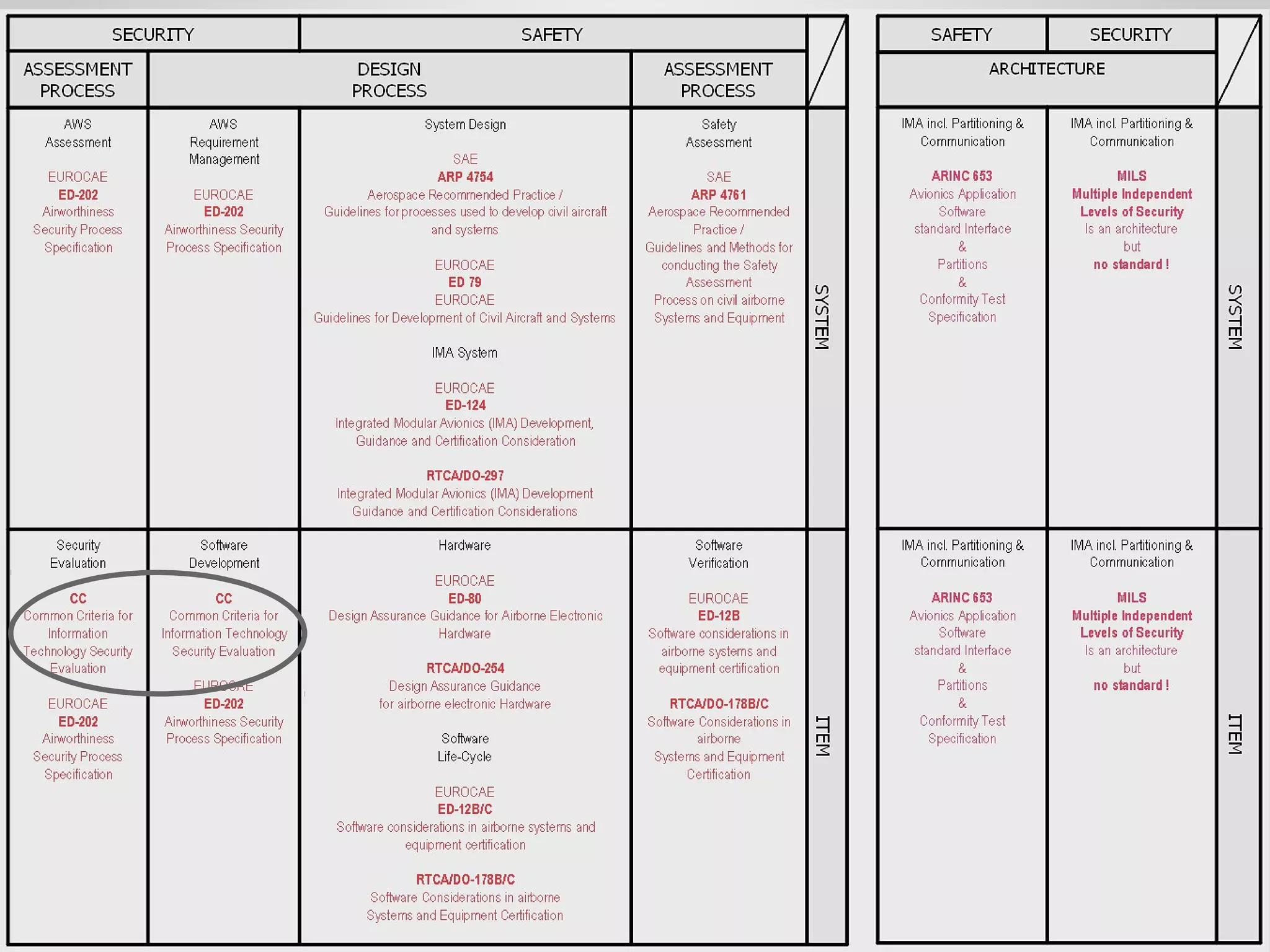 1. The document discusses several standards related to avionics safety and security, including DO-178B for software development processes, safety case analysis, and the Common Criteria for security evaluation.