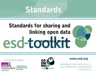 This document discusses standards for sharing and linking open data in local government. It describes ESD's standards model, which defines semantics and syntax. The standards include core reference data like companies and legislation that local authorities can use. Lists from the standards are published as linked open data and can be queried. Examples show how the lists define services, metrics, and other data. The standards aim to improve data sharing and reuse across local government.