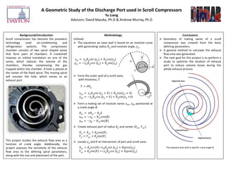 The document describes the methodology used to model the geometry of scroll vanes in a scroll compressor. It involves using involute curves defined by parameters like generating radius and involute angle to determine the equations for the outer wall and thickness of each vane. Mating vanes are then positioned using a crank angle. An exhaust port is created using a radius and center point and its intersection with the vane walls is calculated. The goal is to study exhaust flow area over the crank angle and how parameters like vane geometry and port size and placement affect it. The project aims to optimize port location to reduce volume losses during exhaust.