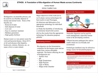 This document discusses using biodigestion to safely dispose of human waste across continents. Biodigestion is an anaerobic process that can remove odors, safely dispose of waste at low cost, and generate methane and high-quality fertilizer. It can help manage human waste in developing countries by making effluent pathogen-free and reusable in an eco-friendly and economical way. The major objectives of this work are to evaluate technologies for biodigestion in rural Nicaragua, select and fabricate an appropriate household technology, study community toilet systems, and use results globally for education.