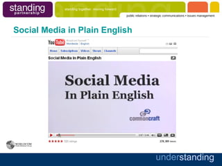 The document provides an overview of using social media for business purposes. It recommends focusing efforts on a few key tools like LinkedIn, Facebook, and Twitter to connect, listen, and engage with audiences. Regularly publishing content through blogging is important for search engine optimization. It stresses defining goals and metrics to evaluate the success of social media strategies.