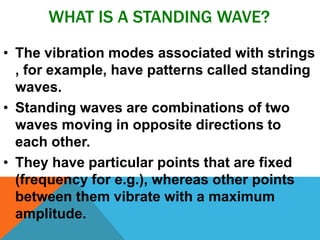 The document explains standing waves, which are formed by two waves moving in opposite directions, creating fixed points called nodes and moving points called anti-nodes. It discusses the relationship between the string length and fundamental frequency, noting that increasing the length decreases the frequency, and provides questions and solutions related to harmonics and resonant frequencies. Visual aids and examples are included to enhance understanding of the concepts presented.