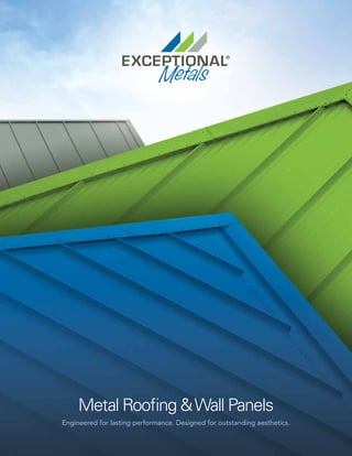 This document provides information about EXCEPTIONAL Metals' metal roofing and wall panel products. It describes several standing seam metal roof systems including EM LokSeam, EM SuperLok, EM BattenLok HS, EM Ultra-Dek, and EM Double-Lok. It also describes the eco-FICIENT insulated metal roof and wall panel series, which provide insulation and energy efficiency. The document explains that EXCEPTIONAL Metals offers a full menu of metal products and accessories to balance performance and aesthetics for commercial and architectural applications.