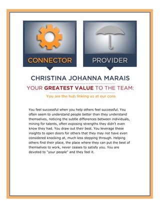 The document describes the results of the StandOut assessment taken by Christina Johanna Marais. The assessment measured how well she matches 9 different roles and identified her primary role of Connector and secondary role of Provider. It provides descriptions of what each role entails and how Christina is likely to be most powerful when capitalizing on bringing people together through her network and sensitivity to others' feelings. The purpose is to help her maximize her strengths by understanding how her top two roles combine and learning ways to accelerate her performance.