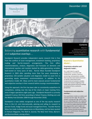 Standpoint Research, founded by Ronnie Moas in 2003, provides independent equity research using a hybrid model that balances quantitative analysis with fundamental insights, resulting in consistent outperformance against competitors. The firm is highly ranked in performance and accuracy metrics, boasting an impressive track record of investment recommendations that have consistently beaten the S&P 500. Standpoint Research offers various services including diagnostics and customized reporting, while maintaining a conflict-free stance in its research practices.