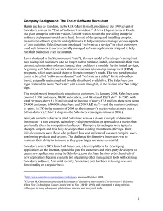 This document summarizes the development challenges facing Salesforce.com in 2006. Steve Greene and Chris Fry proposed a new agile development process to address slowing release cycles and morale issues. However, their VP Harris mandated implementing the new process company-wide instead of starting with a pilot. The existing "waterfall" process was no longer working as revenues grew over 80% annually but releases slowed to once per year. Salesforce.com aimed to maintain innovation as it grew from a disruptive startup into a larger company serving a growing market for cloud-based enterprise software.