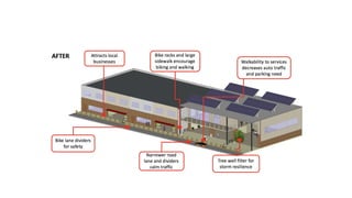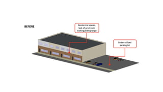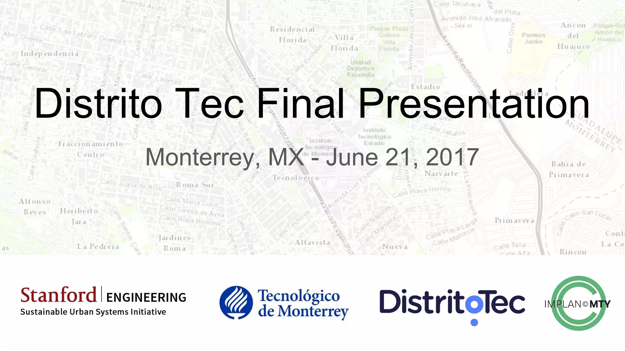 This presentation summarizes work done by Stanford and Tec de Monterrey students on analyzing and defining sustainability problems in Distrito Tec, Monterrey, Mexico. The students used a project-based learning methodology involving problem definition, field visits, and developing analysis on land use, mobility, energy, and water systems. For each topic, the students outlined their methodology, key results, and next steps to further define the problems and pathways to solutions. The goal is to help Distrito Tec set sustainability goals and design infrastructure to meet those goals across health, ecological, social and economic dimensions.