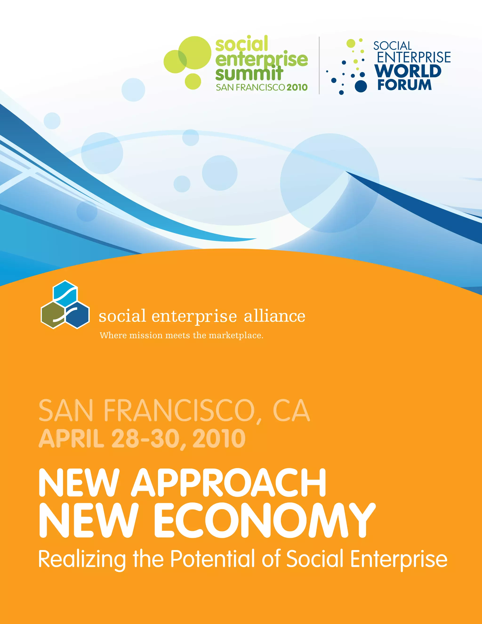 The document provides an agenda for the Social Enterprise Summit taking place April 28-30, 2010 in San Francisco, California. The summit will focus on the theme of "New Approach, New Economy: Realizing the Potential of Social Enterprise" and feature keynote speakers, panel discussions, and workshops across five tracks: investment and finance; models and strategies; policy and advocacy; leadership development and education; and communications and storytelling. Attendees will have opportunities to network, visit social enterprise tours, and attend a leadership awards ceremony and banquet. The summit is hosted by the Social Enterprise Alliance, the leading North American association for the social enterprise field.