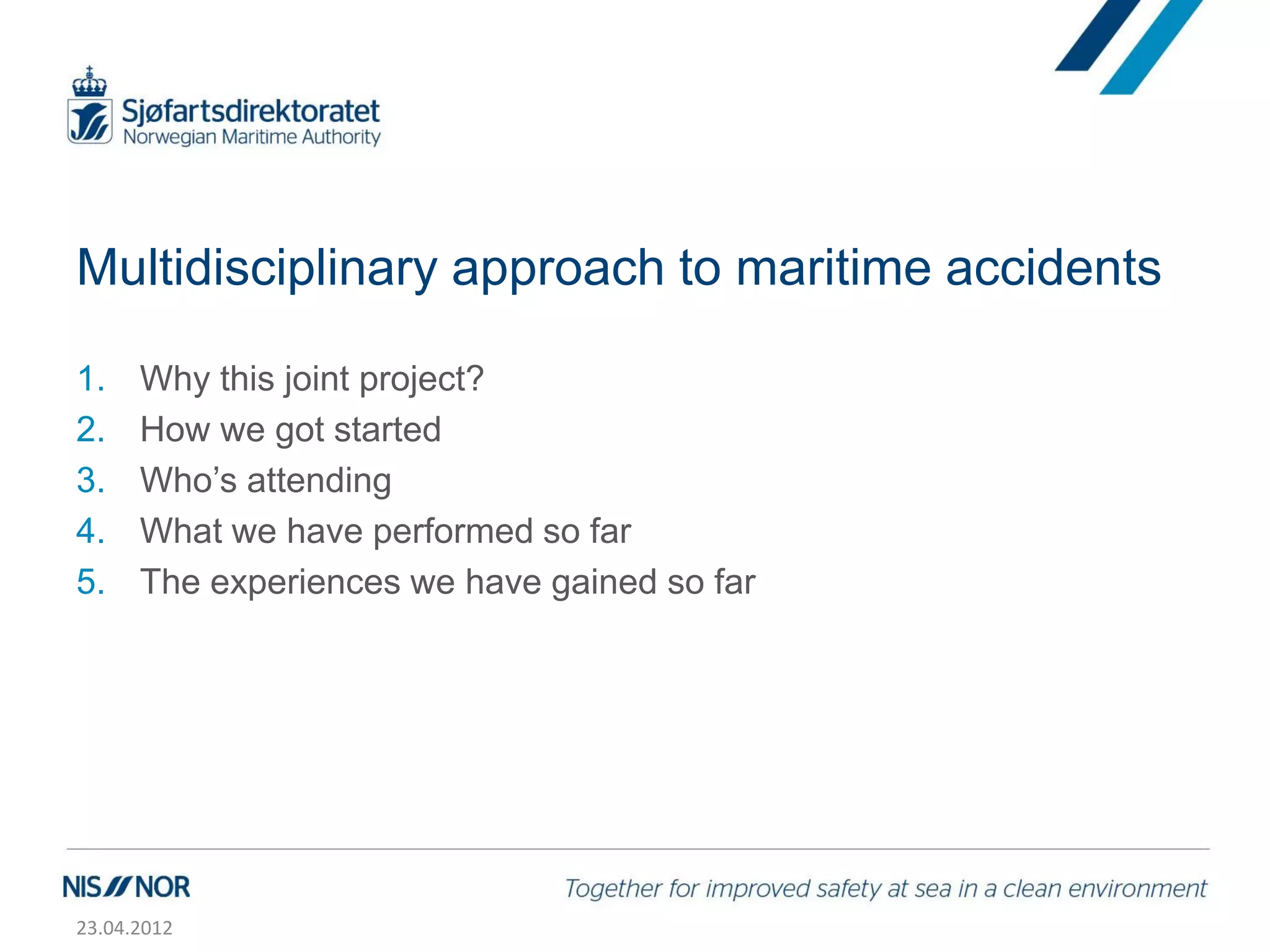 This document summarizes a joint project between authorities and the fishing industry in Norway to improve safety. It describes the objectives of establishing cooperation between these groups, activities conducted so far including workshops, a safety film, and website, and experiences gained. Key activities have been exchanging safety materials, developing a risk assessment tool, coordinating safety campaigns, and initiating new research. Challenges have included organizing the working group and securing funding, but benefits have been building networks and dialogue to promote fishermen safety.