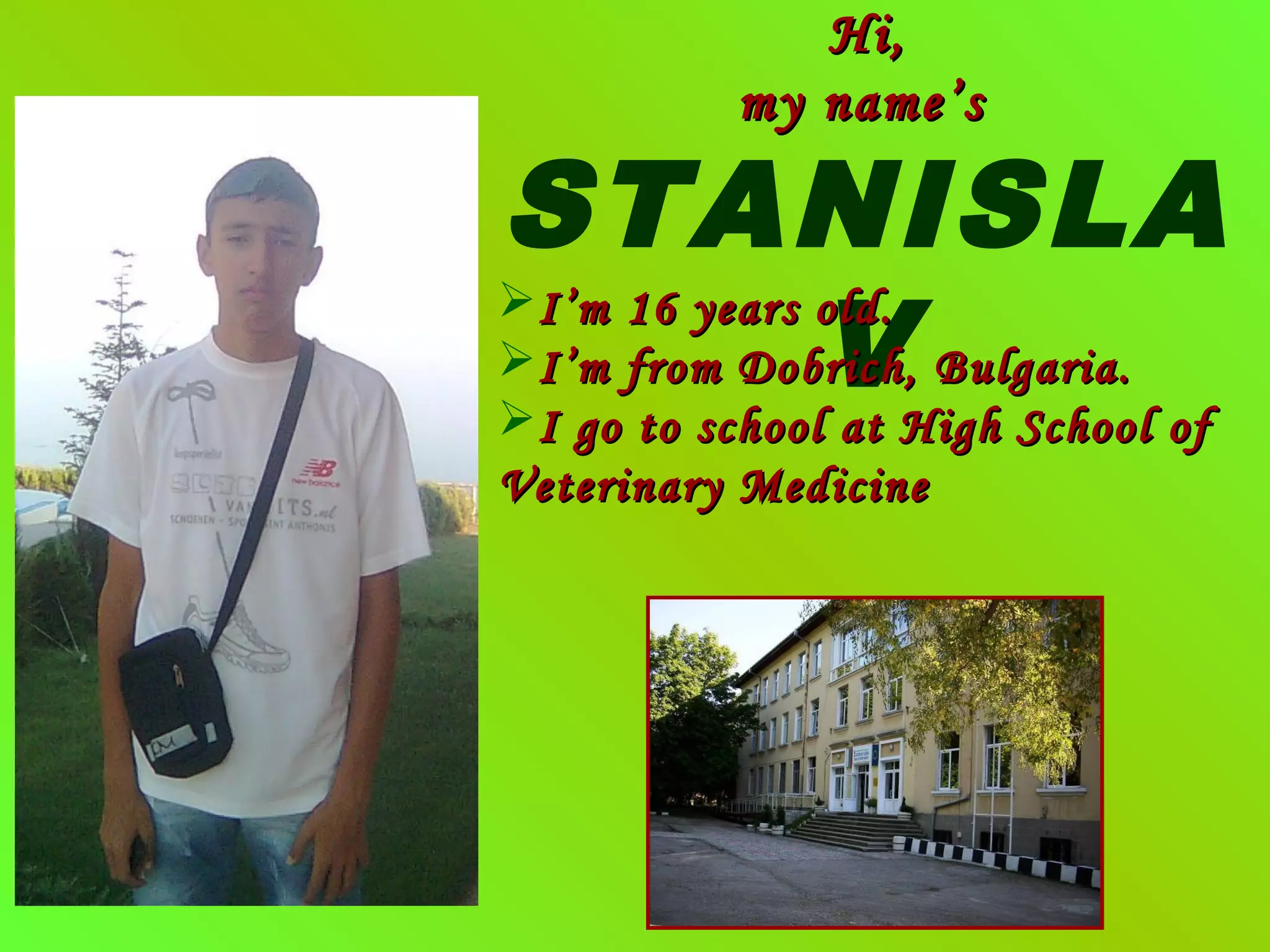 A 16-year-old student from Dobrich, Bulgaria introduces himself and shares details about his life. He attends the Stanislav Veterinary High School of Veterinary Medicine and enjoys animals, going to the gym, listening to the radio, relaxing, and playing football with friends.