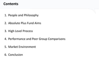 This document provides an overview of the Absolute Plus Fund managed by Marius Oberholzer and his team at STANLIB. It discusses the people and philosophy behind the fund, the aims and high-level process, performance comparisons, the current market environment, and concludes with a summary. The fund uses an absolute return strategy with a focus on capital preservation, diversification across lowly correlated asset classes, and disciplined risk management to aim for returns above inflation over the medium term while keeping volatility low.