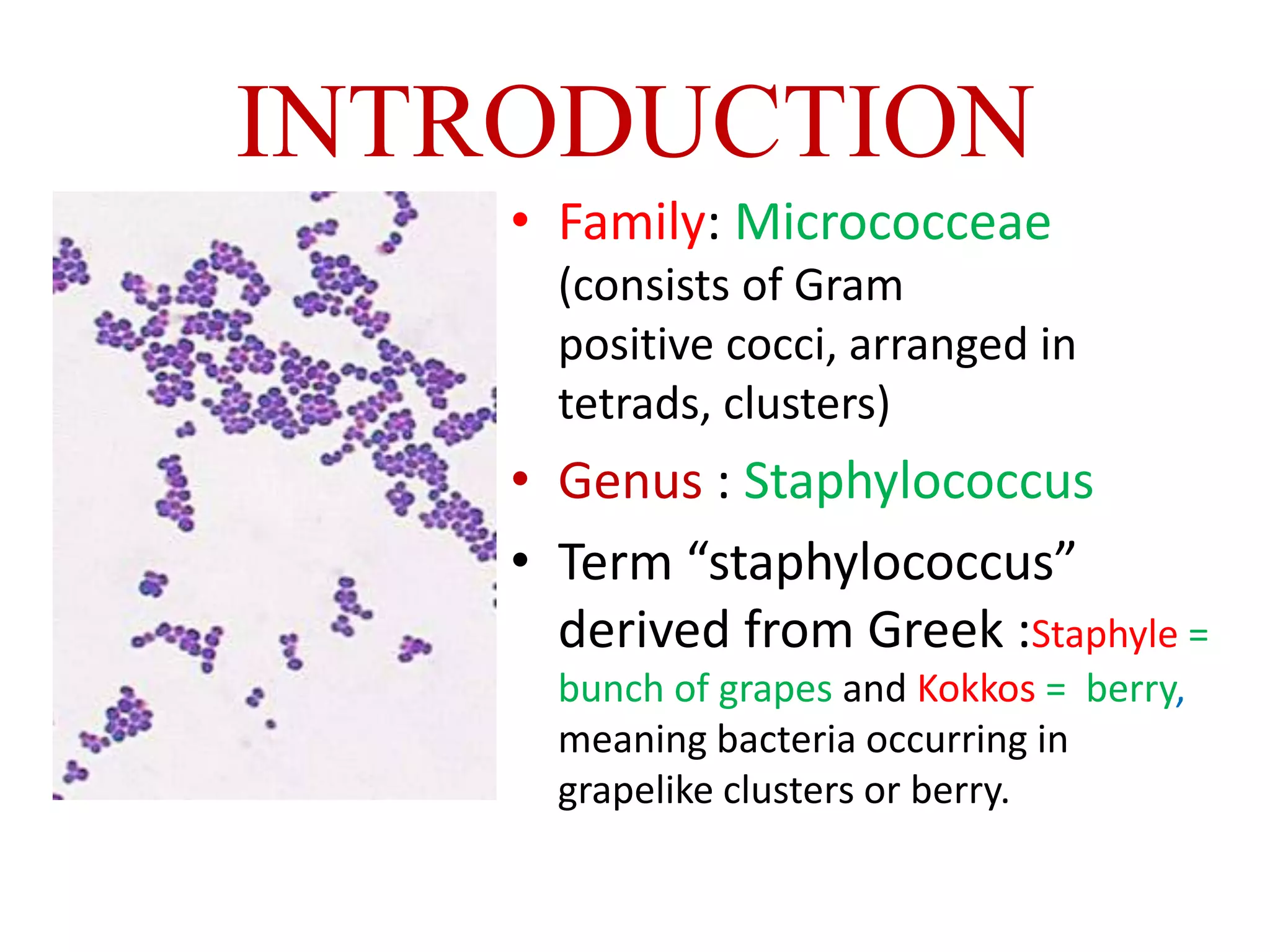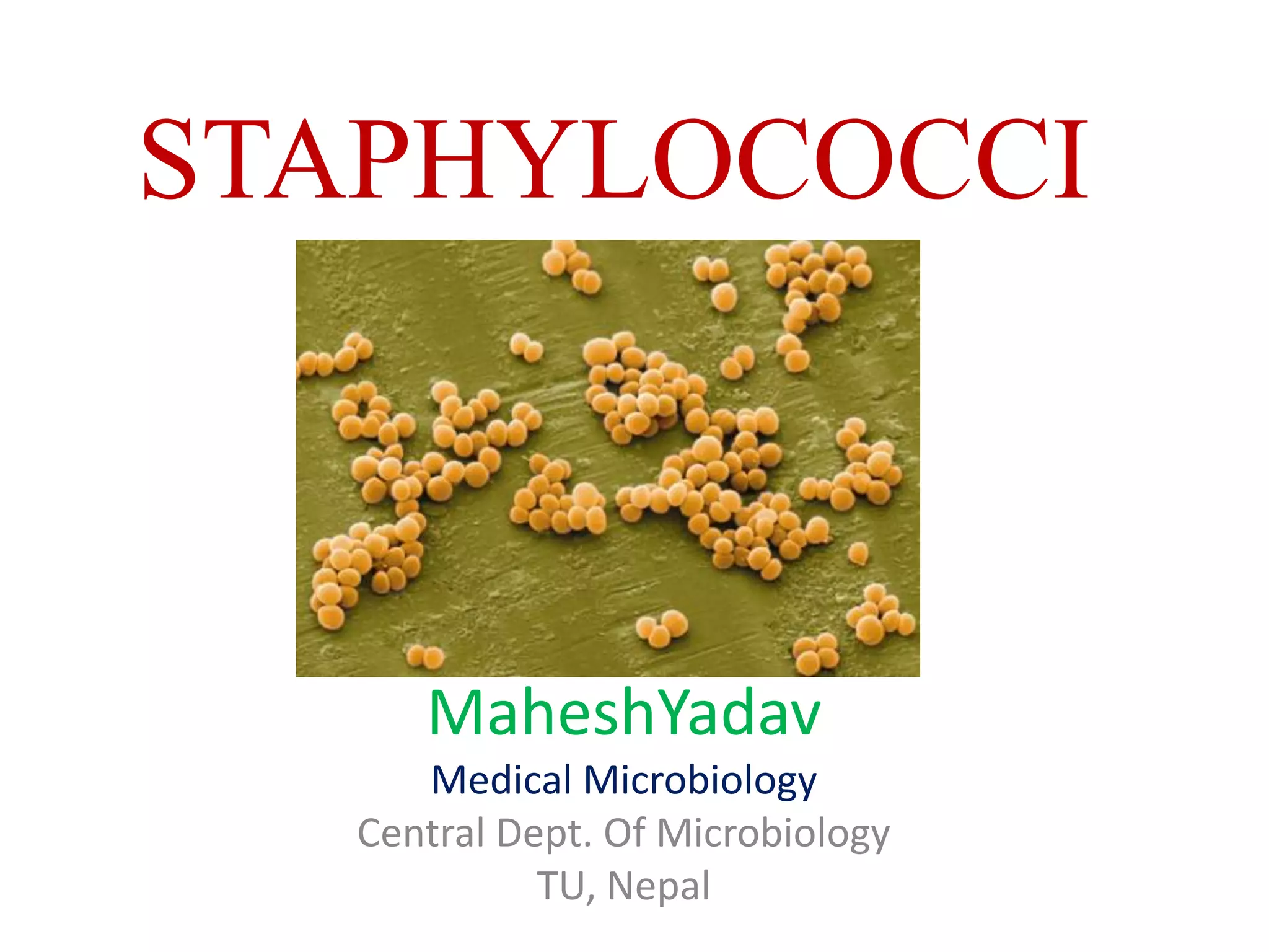 Staphylococci are spherical bacteria that occur in grape-like clusters. Staphylococcus aureus is an important human pathogen that can cause a variety of infections, from minor skin infections to life-threatening conditions like toxic shock syndrome and endocarditis. S. aureus produces several virulence factors like toxins and enzymes that damage tissues and evade the immune system. Laboratory diagnosis involves culture, microscopy, and tests like coagulase to identify S. aureus. Antibiotics are used to treat infections, and prevention focuses on hygiene and safe food handling. Methicillin-resistant S. aureus is an antibiotic resistant form that is more difficult to treat.