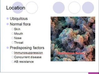 The document provides a comprehensive overview of Staphylococcus, detailing its history, classification, morphology, and biochemical characteristics. It highlights pathogenicity, resistance mechanisms, virulence factors, diseases caused, laboratory diagnosis, and treatment methods for infections like those from Staphylococcus aureus and related species. Emphasis is placed on antibiotic resistance, particularly methicillin-resistant Staphylococcus aureus (MRSA), and the importance of appropriate diagnostic techniques in managing these infections.