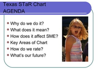 The document discusses Texas STaR Chart, a self-assessment tool for schools to evaluate their technology integration efforts. It provides an overview of why schools complete the STaR Chart, how it affects Sorters Mill School, and their current and future ratings in key areas such as teaching and learning, educator preparation, and infrastructure. Sorters Mill is rated as advanced in several areas but needs continued focus on effectively integrating technology into teaching and learning.