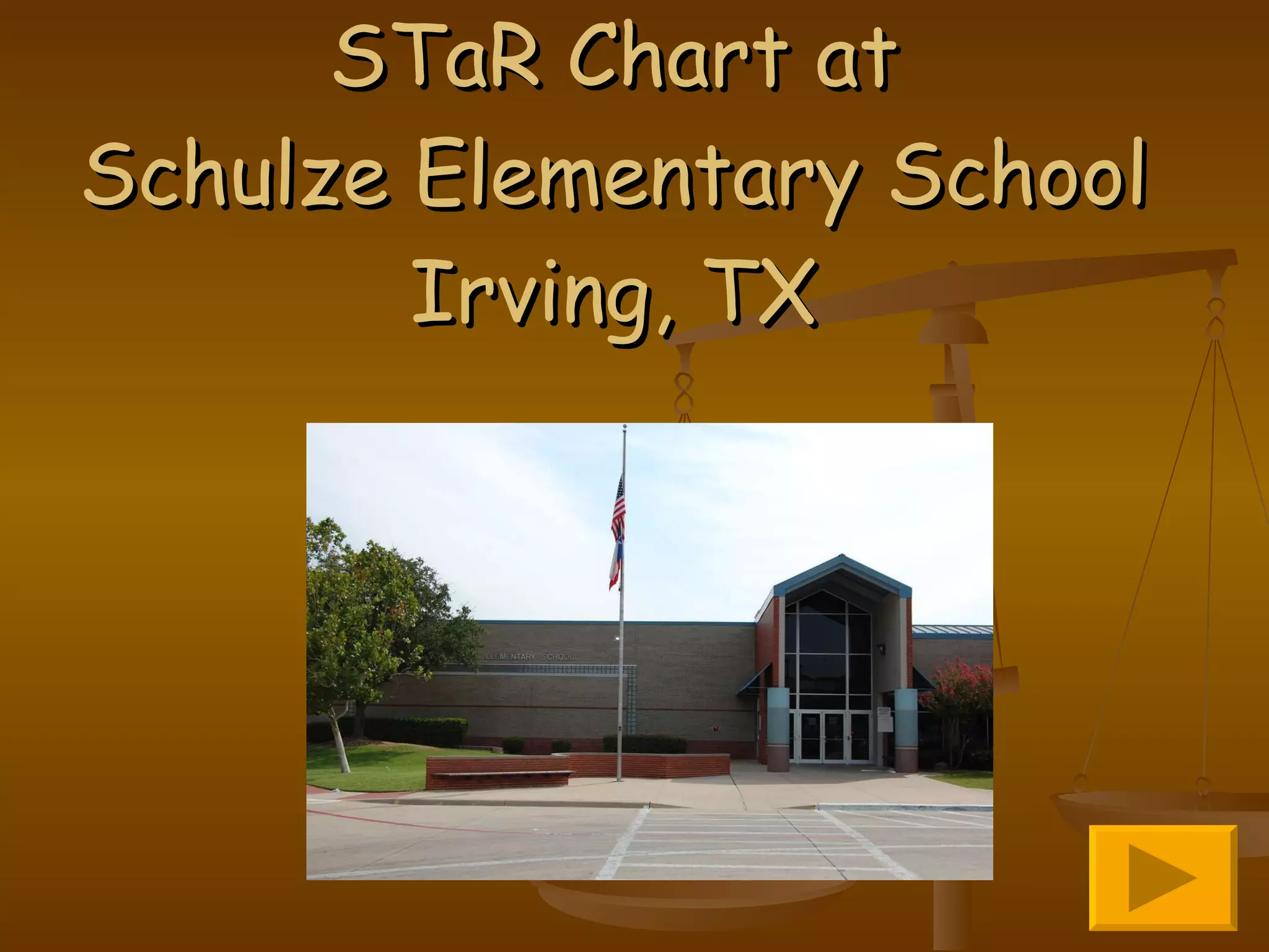 The document discusses the Texas STaR Chart, which measures school progress in four key technology areas: Teaching & Learning, Educator Preparation & Development, Leadership/Administration/Instructional Support, and Infrastructure. It explains that the chart helps schools determine professional development needs and provides data to teachers and districts. The document then shares that Schulze Elementary scores between 15-20 in each area, indicating an "Advanced Tech" level, and concludes by discussing ways to improve and ideas for future professional development.
