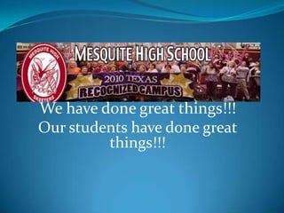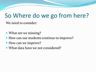 This document summarizes a school's progress in meeting technology goals as measured by the STaR Chart assessment over three years. According to the STaR Chart, the school has been rated as "Developing Tech" in teaching and learning and educator preparation and development, though educator preparation saw a one-point increase this year. The school has been rated "Advanced Tech" in leadership and instructional support. Infrastructure for technology has varied from advanced to developing. The document encourages using this data to improve technology use, learning, and support for students.