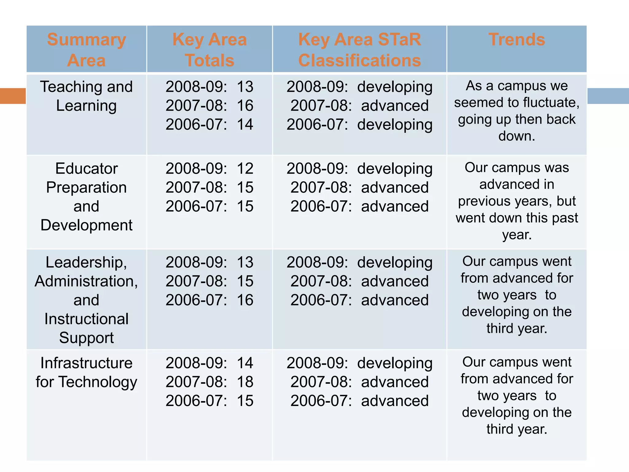 This document discusses the Texas STaR Chart, which is an assessment tool used to evaluate schools' progress in four key technology areas: teaching and learning, educator preparation, leadership/support, and infrastructure. It provides details on each area and shows the campus results from WFHS from 2003-2010. The chart is designed to help schools meet state technology goals and identify staff training needs. It provides classifications for each area to show a campus' level of development and recommendations for using the results to improve technology integration and instruction.