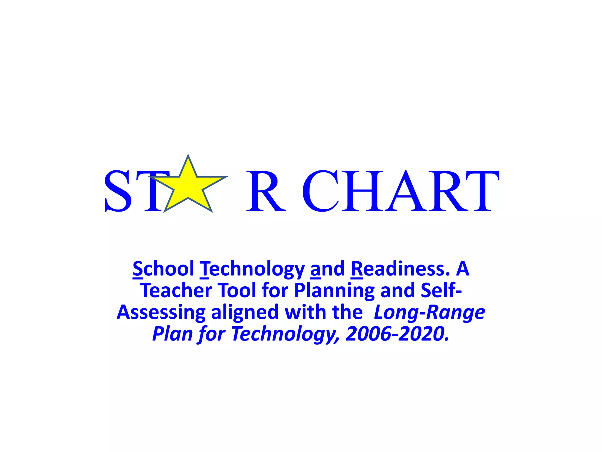 The document outlines a STaR Chart tool for teachers to self-assess their use of technology based on Texas's Long-Range Plan for Technology. The STaR Chart evaluates four key areas: Teaching and Learning, Educator Preparation, Leadership and Support, and Infrastructure. It provides teachers with goals and a process to discuss technology integration with their grade level teams. The agenda also includes analyzing a teacher's past results, setting goals for their school, and reflecting on areas where more training and support is needed.