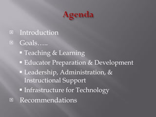 The document outlines recommendations from the Texas STaR Chart for improving technology use in education. It discusses four areas of focus: teaching and learning, educator preparation and development, leadership and infrastructure. Key recommendations include transforming learning so students solve real-world problems, using online assessments to guide staff development, empowering teachers to mentor colleagues and collaborate with experts, and ensuring all classrooms are connected to online resources.