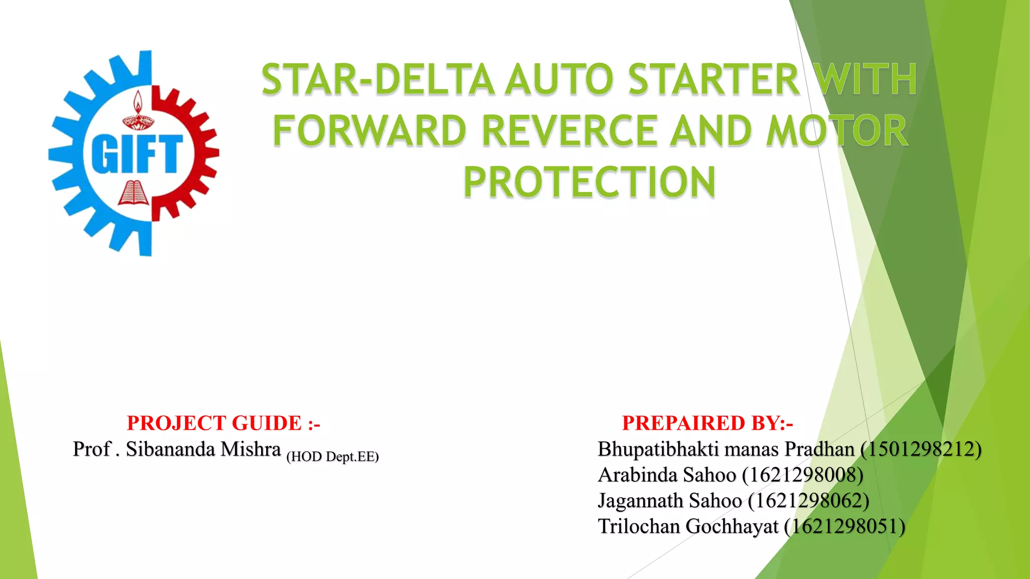 The document provides a comprehensive project guide on the star-delta starting method for induction motors, emphasizing the reduction of high starting currents and motor protection features. Key objectives include achieving automatic star to delta switching and enabling forward and reverse motor operations while ensuring safety through various protection mechanisms. The project details components, operation methods, cost analysis, and concludes with the benefits of using this approach over direct online starters.