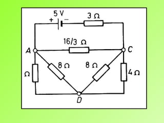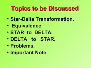 This document discusses star-delta transformations and their equivalence. It provides the formulas for converting between star and delta connections by equating the resistances between corresponding terminals. Examples are given of using the formulas to solve for unknown resistances in both directions. Conversion methods are demonstrated on sample networks, such as finding the resistance between two points or the current drawn from a battery. An important note is that network simplification may lose original points, so care must be taken to retain relevant information.