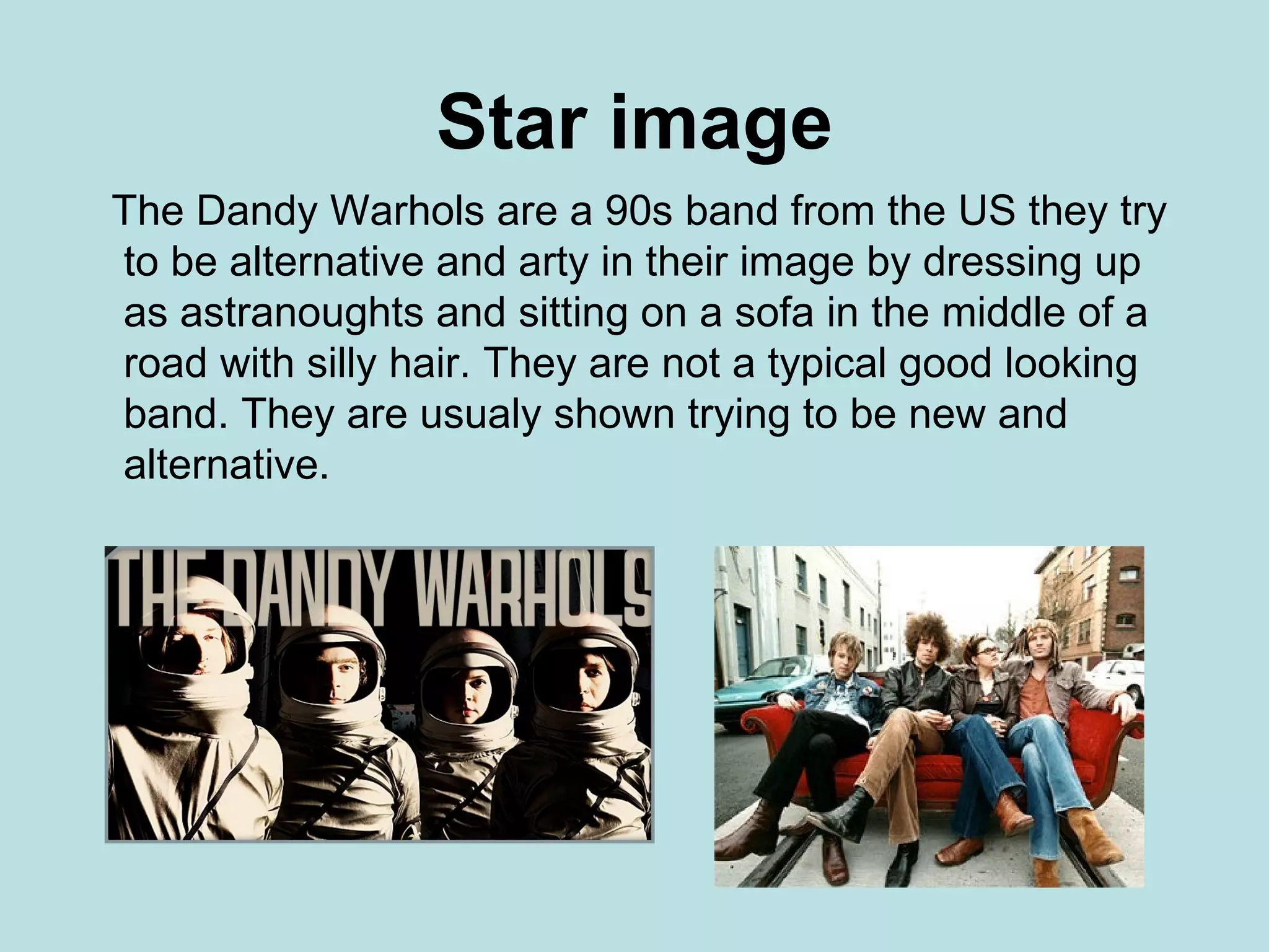 The document discusses potential music video treatments for two different artists. For the song "Godless" by The Dandy Warhols, the proposed treatment involves four people in space suits miming the instruments and dancing around the world and in space with a quirky, non-realistic background. For the Jamie T song "Ike & Tina", the proposed treatment features four guys lazily watching television and eating Chinese food to reflect the lyrics about underachieving.