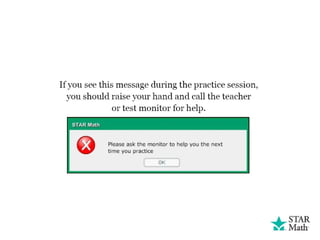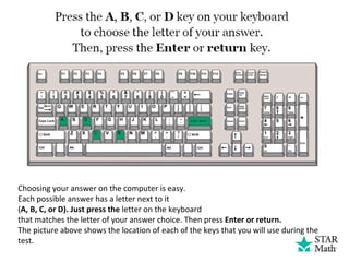 The document outlines instructions for a math test where students select answers from multiple choices, including the option 'not given' if the correct answer isn't listed. It explains the process of answering questions on a computer, including how to select and change answers before submission. Additionally, it informs students about time constraints and the procedure to follow upon completing the test.