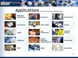 Star Micronics America provides a full range of retail and point-of-sale printing solutions including their TSP100, TSP700II, SP700, and TSP800Rx series printers. Their hybrid printer, the HSP7000, offers ultra-fast printing speeds of 250mm/s with a drop-in paper loading design. Star Micronics also offers options like splash proof covers, vertical stands, and receipt alarms to customize their printers for different industries including banking, retail, healthcare, and more.