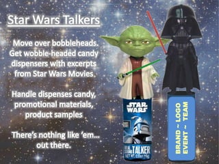 Candyrific offers customizable light-up Star Wars-themed wands for events, featuring branding options and interactive promotions like stickers and samples. Established in 2000, the company excels in merchandise marketing and has a robust distribution network across major retailers. With a strong global presence, they efficiently provide a wide range of promotional items for corporate brands and sports franchises.