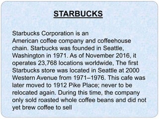 Starbucks is an American coffee company founded in 1971 in Seattle, Washington. It operates over 23,000 locations worldwide. Starbucks' mission is to inspire and nurture the human spirit through high-quality coffee and customer service. In 2011, Starbucks entered a joint venture with Tata Global Beverages to open locations in India. Starbucks opened its first two Indian stores in Mumbai and Delhi in 2012. It has since expanded to other Indian cities like Hyderabad. Starbucks emphasizes its core values of warmth, courage, respect, accountability, and performance through a human lens. It offers coffee, food, and merchandise both in stores and online globally.