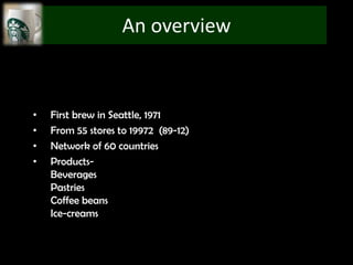 The document provides an overview of Starbucks, including that it opened its first store in 1971 in Seattle and has grown to over 29,972 stores in 60+ countries. It discusses Starbucks' target demographics such as adults ages 25-40, young adults ages 18-24, and kids/teens ages 13-17. The document also performs a Porter's 5 forces analysis, SWOT analysis, and discusses recommendations including concentrated growth strategy and expansion into new markets through Ansoff's matrix.