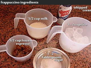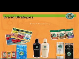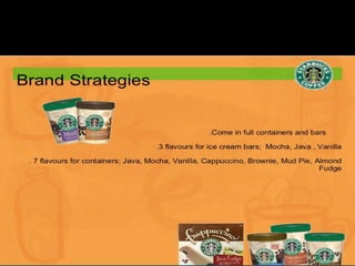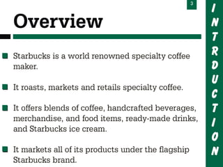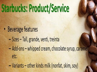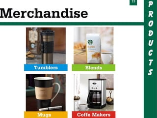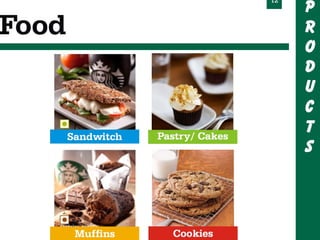 Starbucks offers a wide variety of coffee beverages and foods. They are known for their coffee, offering over 30 blends, and seasonal drinks like pumpkin spice lattes. In addition to coffee and food served in stores, Starbucks sells whole bean coffee, bottled frappuccinos, and tea worldwide through grocery stores and hotels. One of their most successful products is the bottled frappuccino, which is convenient and available in many stores.