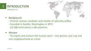 Starbucks uses a balanced scorecard (BSC) approach to implement its strategy across the organization. The BSC framework includes four perspectives: financial, customer, internal business processes, and innovation, learning and growth. Starbucks' mission is to inspire and nurture the human spirit through coffee. It has over 23,000 stores globally and pursues strategic imperatives like penetrating new markets, leveraging its brand, being a social gathering place, being an environmental leader, and investing in employees.